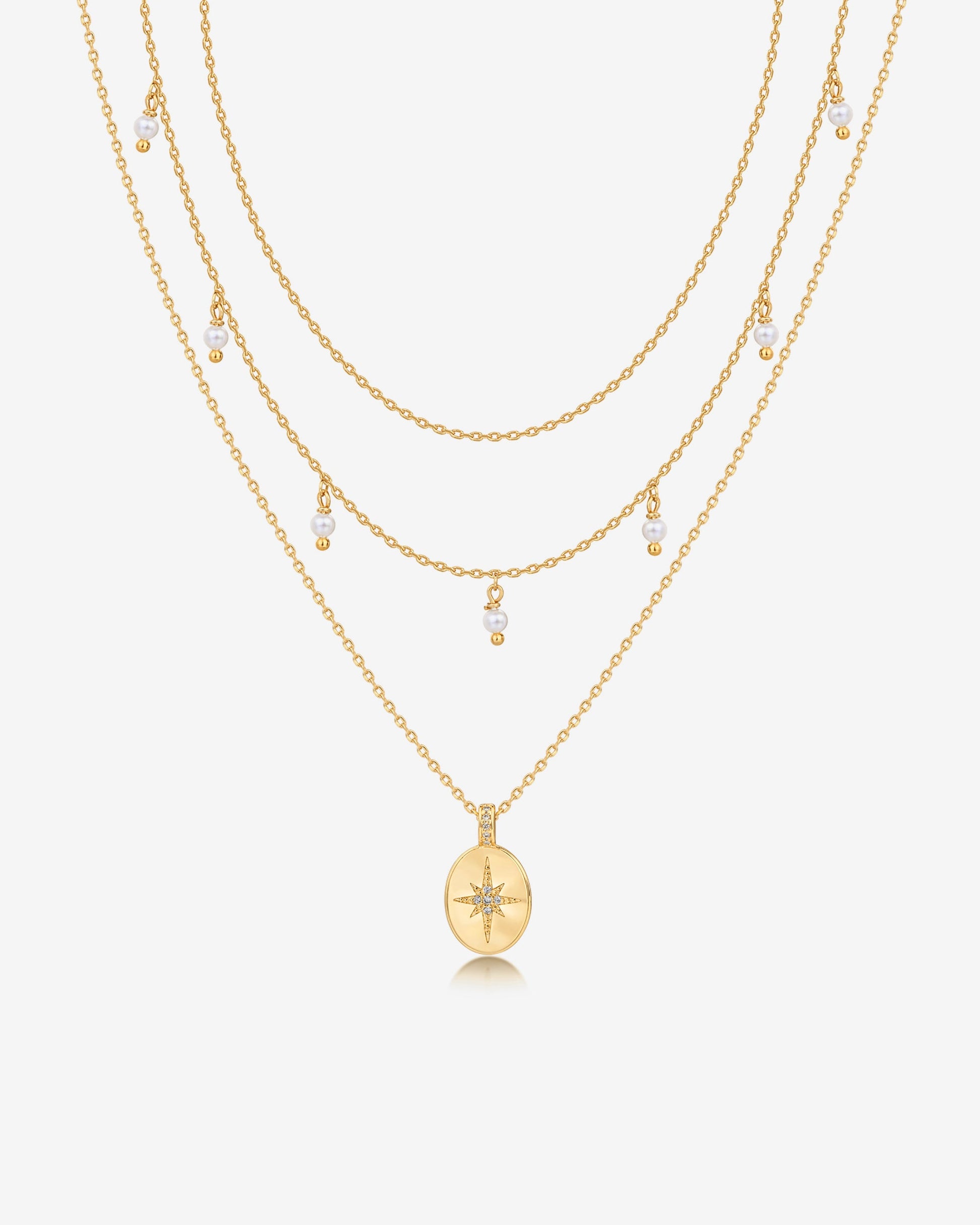 Let our north star layered necklace guide you to stylish days. Layered along with a simple necklace as well as a pearl station necklace for a minimalistic look.