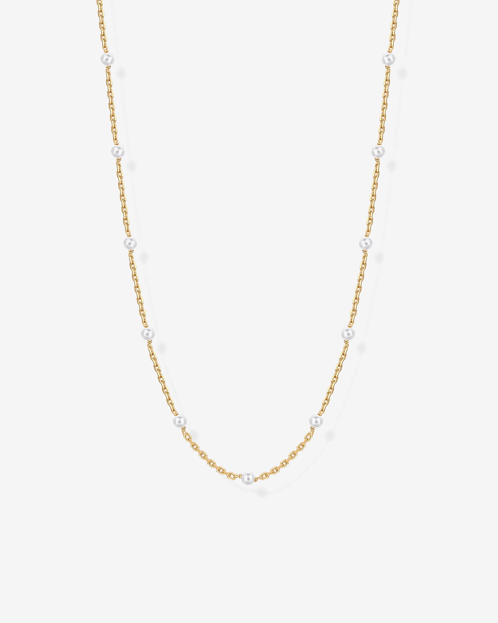 This necklace is made for modern elegance, blending classic charm with contemporary style. Featuring lustrous shell pearls on a delicate 14K gold-plated station chain, it’s the perfect balance of timeless and trendy.Designed for versatility, this pearl gold necklace measures 15" + 3" with a 2mm chain width and 4mm pearls, making it ideal for layering or wearing solo. Whether you're looking for a pearl choker necklace for women, a dainty pearl drop necklace, or an elegant single pearl necklace gold, this piece is the perfect finishing touch.A must-have for jewelry lovers, brides, and bridesmaids, this pavoi pearl necklace is an effortless way to add sophistication to any outfit.Chain length: 15" + 3"Chain width: 2mmPearl width: 4mm