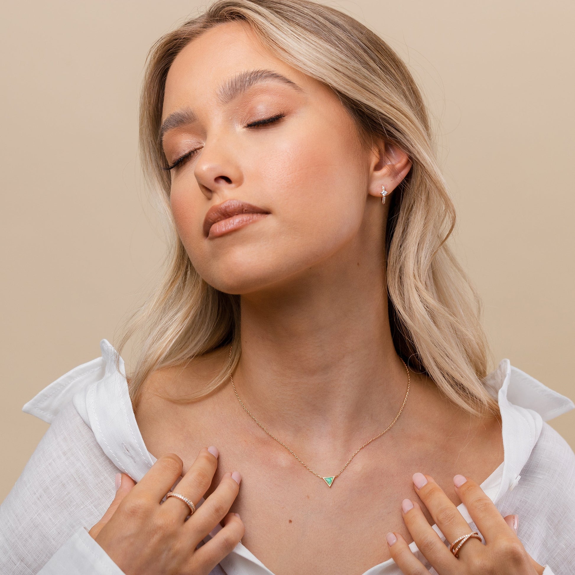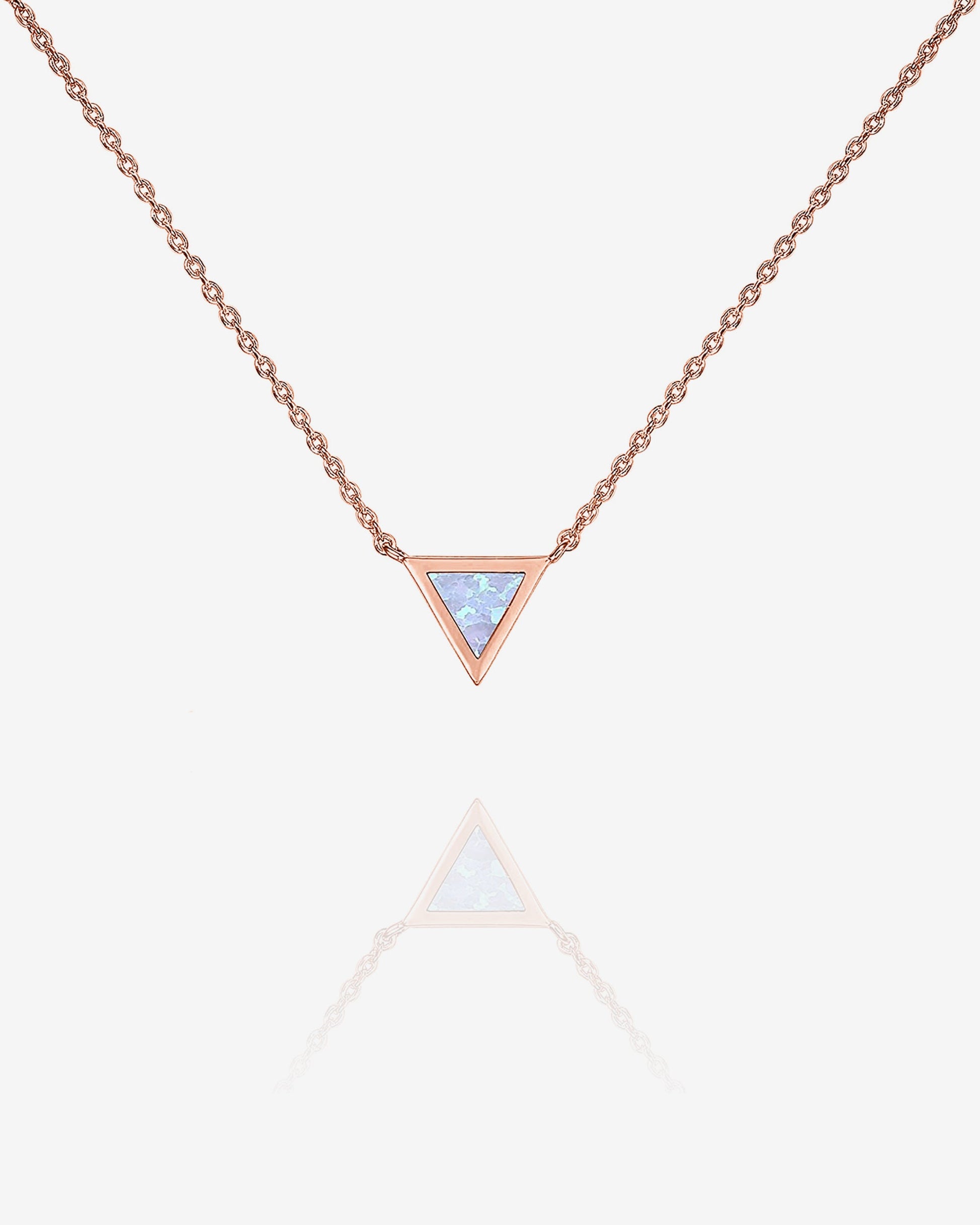 Meet your new favorite piece- our trinity necklace. With a gorgeous created triangle shaped opal bezel set, hanging from a chic cable chain. This piece is sure to frequent your rotation.